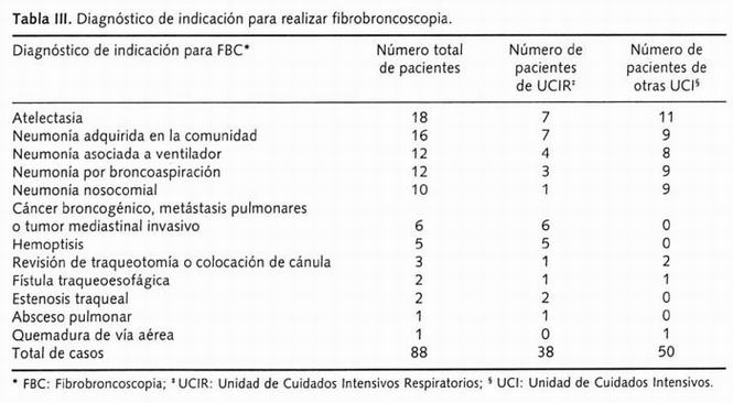 Material and methods: Observational clinic study retrospective and prospective of patients hospitalized in ICU with FOB, from October 2001-September 2003. In all cases it was recorded diagnostic indication for FOB, findings, complications and ICU where it comes from. Test of proportions with confidence limits for binomial distribution (Bernoulli) was applied.