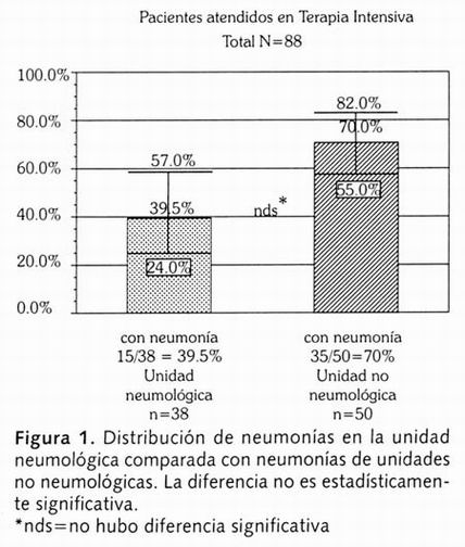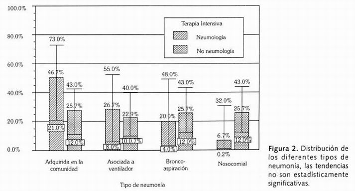 De un total de 88 pacientes atendidos en diversas terapias intensivas, 38 fueron atendidos en una unidad de terapia intensiva neumológica, 15 de ellos tuvieron neumonía lo que representó el 39.5% (del total de casos de la UCIR). Los 50 pacientes restantes procedían de unidades de terapia intensiva no neumológica y de estos casos 35 tuvieron neumonía (70% del total de casos de otras UCI).