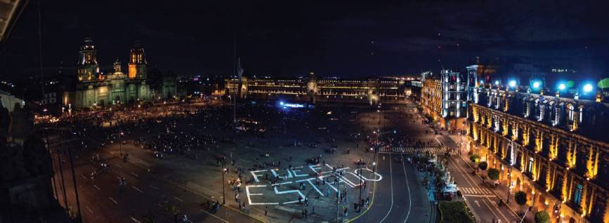 Rexiste participated in citizen mobilizations for Ayotzinapa’s justice between 2014 and 2015.6 One of its most important initial actions was the monumental painting “Fue el Estado” (“It was the State”) that they made in the Zócalo esplanade in Mexico City, on October 22nd, 2014 (see Figure 2). This piece is the result of the use of 30 liters of paint, a registry and a circulation strategy that generated a viral message. The collective recovered the slogan that imputed responsibility to the Mexican State for the forced disappearance of the 43 students of the Escuela Normal Isidro Burgos in Iguala, Guerrero.