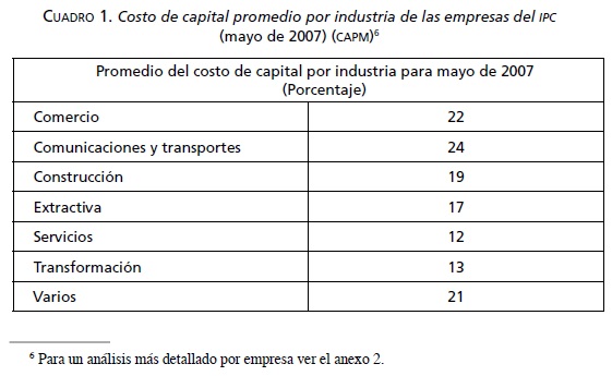 Se presentan los promedios por industria del costo del capital anual real; podemos observar que el sector con mayor costo de capital es el de "comunicaciones y transportes", con una tasa de 24% de costo de capital, y la más baja la obtuvo el "sector servicios", con un costo de capital de 12%. En promedio se tiene un costo de 19%. Si hacemos un análisis más detallado tenemos que bajo el CAPM las tres empresas con mayor costo de capital son Elektra (28%), TV Azteca (28%) y GFamsa (26%), y las tres empresas con menor costo de capital son GAP (2%), Kimber (9%) y OMA (10%).