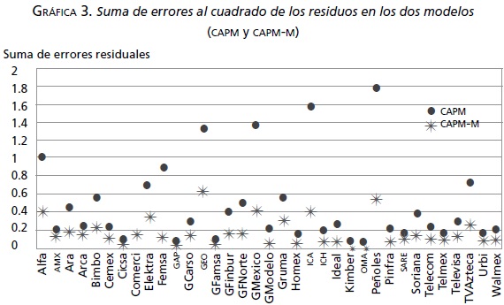 En la gráfica 3 se presentan los hallazgos de los dos modelos, en donde encontramos que el modelo con menor error es el CAPM-M, por lo que es más eficiente.