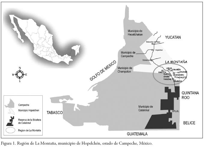 La Montaña se encuentra localizada en la parte norte de la Reserva de la Biosfera de Calakmul (RBC), en el municipio de Hopelchén, estado de Campeche, México (Figura 1). Conforma la parte sur de la región de Los Chenes e incluye ocho ejidos. Se localiza entre los 18° 59'48" y 19° 14'45" de latitud Norte y 89° 10'10" y 89°25'07"de longitud Oeste. El área total abarca aproximadamente 200 000 ha con una población menor a 5 000 habitantes.