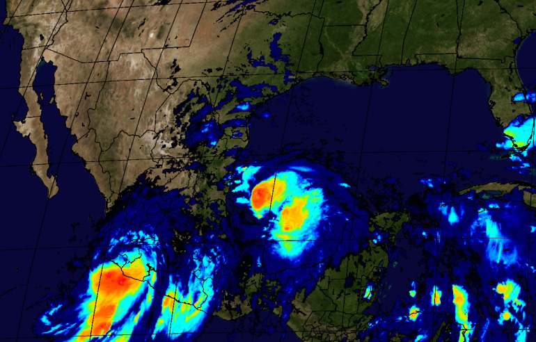 Figura 1 Imagen de intensidades de precipitación (mm/h) a partir del hidroestimador (elaboración propia) de los eventos meteorológicos, el Huracán Categoría I Manuel en el Pacífico y la tormenta tropical Ingrid en el Atlántico (septiembre 2013).