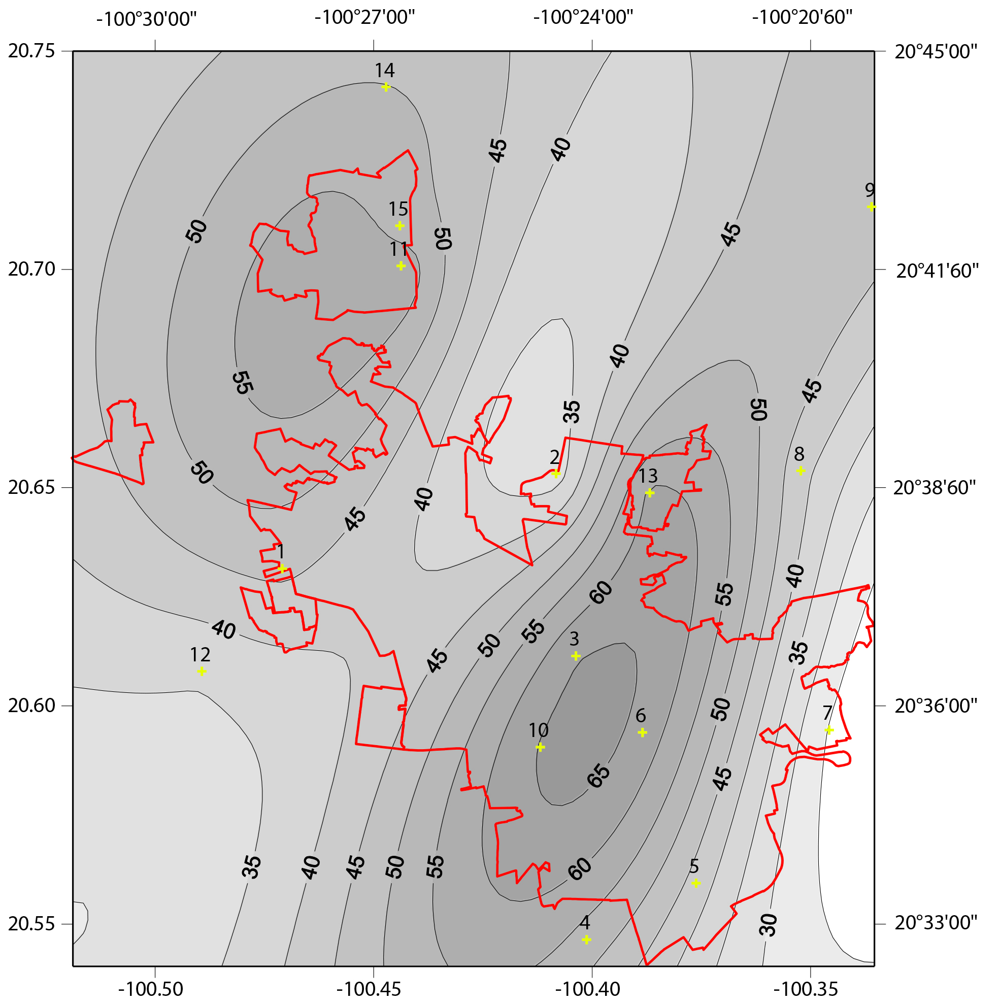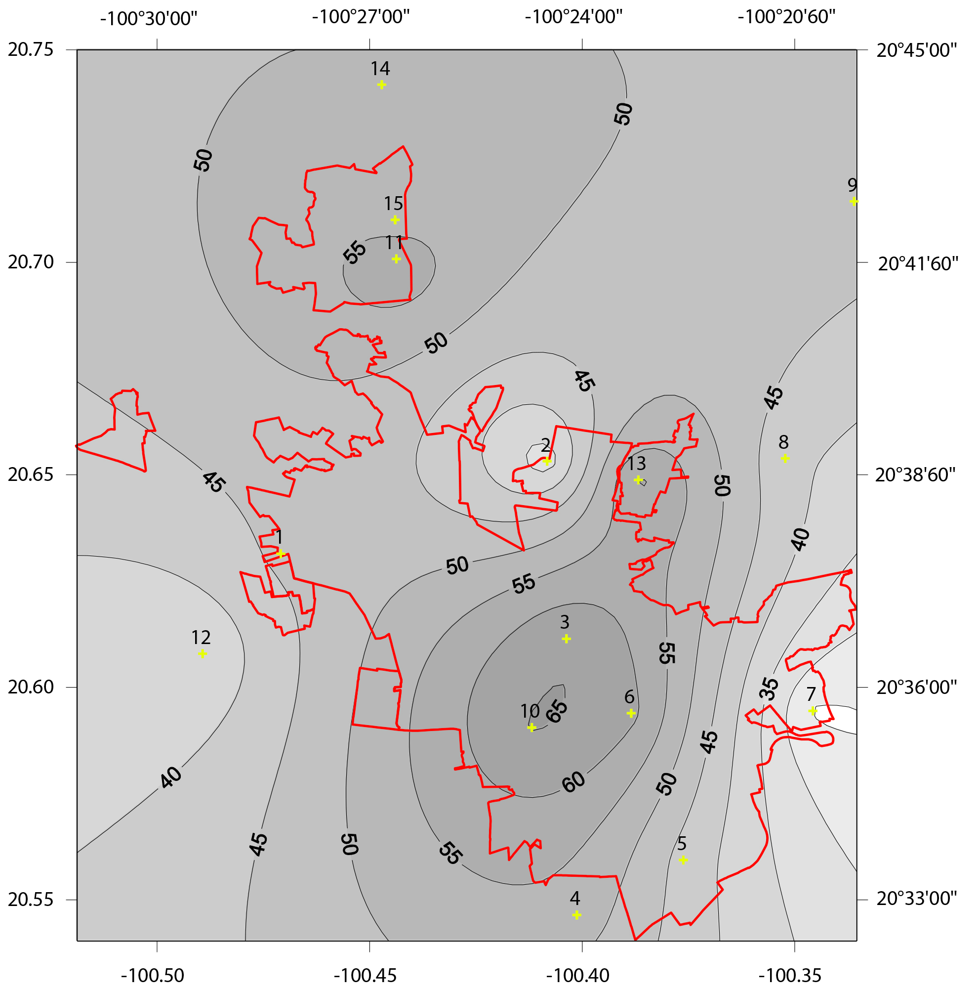 Figura 7 Cartografía de las isoyetas de la tormenta del 18 de agosto 2014 sobre la zona metropolitana de Querétaro, considerando una interpolación con Kriging normal.