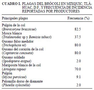 En el cuadro I se presentan las principales plagas y frecuencias reportadas por los productores para el cultivo de brócoli en Mixquic, D.F, durante el ciclo de verano 2005. Destaca que las plagas que más comúnmente atacan el brócoli son el pulgón de la col, el gusano medidor falso, el gusano del corazón de la col y la mariposita blanca de la col. Estos resultados coinciden con los reportados para este mismo cultivo en Acatzingo, Puebla, por Barrios et al. (2004), quienes reportan a B. brassicae (49.65 insectos/planta), P. xylostella (4.5 insectos/planta) y C. consueta (0.48 insectos/planta) como las especies de plagas más abundantes.