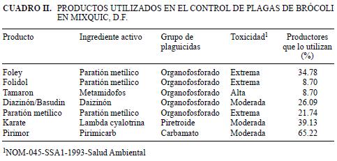 El cultivo del brócoli en Mixquic, D.F., constituye la actividad agrícola principal; se siembra en cerca de 400 ha y hasta en tres ciclos al año en la misma parcela. Es atacado por varias plagas, las cuales son controladas mediante la aplicación de productos organofosforados, piretroides y carbamatos principalmente, solos o en mezclas, sin existir un programa de manejo establecido. Las aplicaciones de estos productos dependen de la presencia de las plagas (productores de la zona y personal técnico de la Junta Local de Sanidad Vegetal de Mixquic, D. F., comunicación personal).