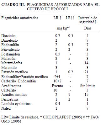 La guía de plaguicidas autorizados de uso agrícola (CICLOPLAFEST 2005) recomienda los productos que se señalan en el cuadro III para el control de plagas del brócoli. Adicionalmente se presenta el intervalo de seguridad y el límite máximo de residuos de estos productos que establece la guía de plaguicidas y los reportados por el Codex alimentarius.