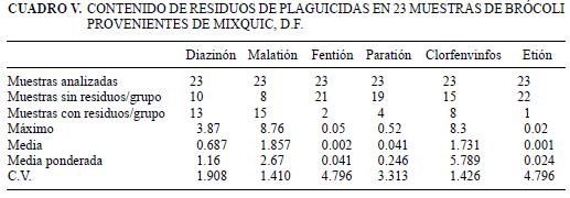 La alta incidencia de Brevicoryne brassicae, Trichoplusia ni, Copitarsia consueta, Artogeia rapae, Trialeurodes sp y Bermisia tabaci, reportadas por los productores como las principales plagas en el cultivo de brócoli en Mixquic, con una frecuencia de 82.5, 80, 80, 70 y 37.7 % respectivamente, hace necesaria una serie de aplicaciones de productos químicos para su control, donde los plaguicidas organofosforados constituyen tratamientos clásicos.