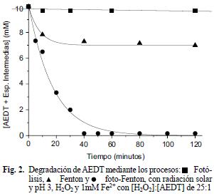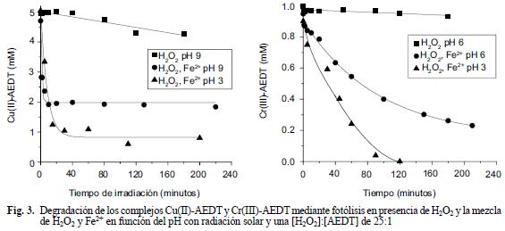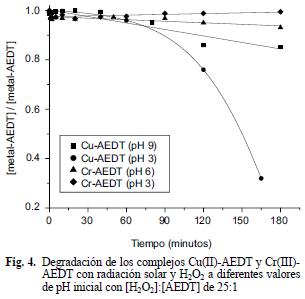 La figura 3 también muestra el perfil de degradación de Cu(II)AEDT a pH 9 y Cr(III)AEDT a pH 6 en presencia de Fe(II) y H2O2 con radiación solar. Es interesante observar que la sola presencia de Fe (II) en la solución, incrementa la degradación de los complejos. Obviamente, la degradación inicial de los complejos se lleva a cabo por los radicales OH• generados por la descomposición fotolítica de H2O2 catalizada por las especies de hierro, debido a que las especies de cobre y cromo no están libres inicialmente en solución; en consecuencia, no pueden catalizar la descomposición de H2O2 en ese estado. A medida que los complejos AEDT se descomponen, especies de cobre y cromo se incorporan a la solución e influencian su degradación. En el caso de Cu(II)AEDT (pH 9), la influencia es parcialmente favorable, posiblemente por la formación de hidróxido de cobre y complejos hidroxilo que podrían inhibir la descomposición de H2O2 para generar OH• de manera efectiva. Como consecuencia, sólo se logra 60 % de degradación del complejo en los primeros tres minutos de fotorreacción solar, sin degradar aún más el complejo en un tiempo de reacción mayor.