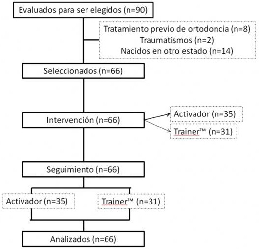 Previa aceptación por parte del comité de investigación y ética del Hospital de Salud Mental “Dr. Miguel Vallebueno”, con No. Reg. 000 001, se realizó un estudio transversal comparativo. Para la selección de los participantes se eligieron 8 escuelas secundarias federales de la ciudad de Durango, Durango, con un total de 900 alumnos inscritos. Posterior a esto, se solicitó autorización del encargado de dichas instituciones para realizar la selección y revisión de los estudiantes de forma aleatoria y que cumplieran con los criterios de selección como tener entre 11 y 14 años, ser originario y radicar en la ciudad de Durango, Durango, no tener o haber tenido tratamientos ortopédicos u ortodóncicos previos, y diagnosticados con MoCII. Se realizó la invitación directa a la muestra seleccionada tanto al alumno como al padre o tutor, a quienes se les explicaron los motivos y procedimientos a realizar en el estudio solicitando el asentimiento informado para poder participar. Dentro de los criterios de exclusión se tomaron en cuenta participantes con defectos congénitos, tratamiento previo o diferente a los seleccionados en el proyecto y como criterios de eliminación se consideran individuos que terminaron voluntariamente con su participación, así como muestras no amplificables por reacción en cadena de la polimerasa (PCR, por sus siglas en ingles). Este trabajo de investigación se desarrolló en paralelo con un especialista en ortopedia maxilar, quién aplicó dos tratamientos ortopédicos miofuncionales como el Activador de Andersen y Trainer Myobrace fase 2 LMR, asignados de forma aleatoria, y de esta manera establecer la correlación de la presencia del polimorfismo rs1815739 del gen ACTNIII y el resultado de los tratamientos antes mencionados.