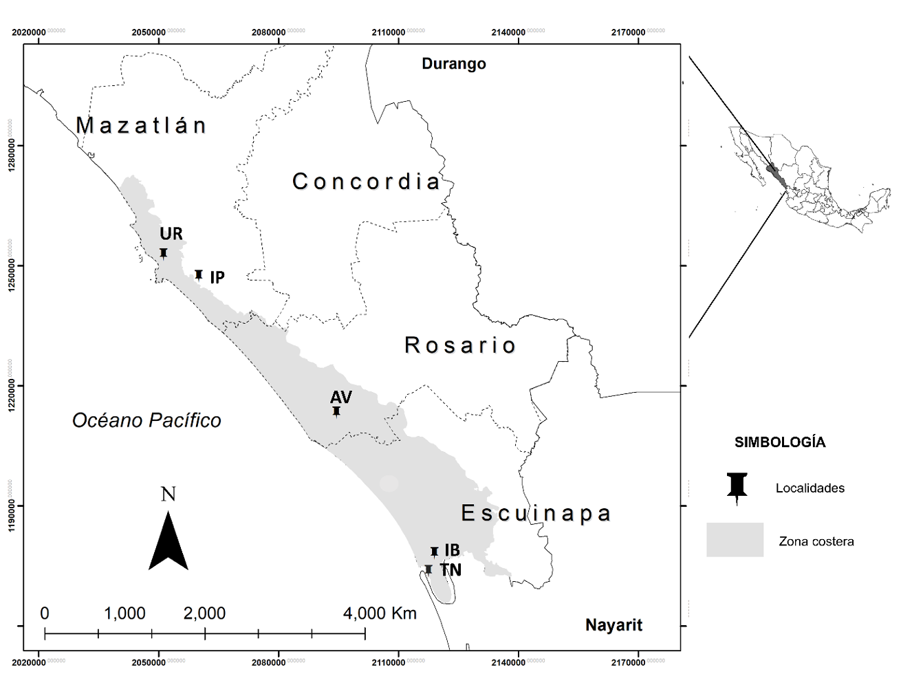 El estudio se llevó a cabo en localidades de la zona costera del sur de Sinaloa, México, dentro de los municipios de Mazatlán, El Rosario y Escuinapa, que en conjunto albergan una población de poco más de 610 000 personas, superior al 20% del total estatal (Instituto Nacional de Estadística y Geografía [INEGI], 2020).