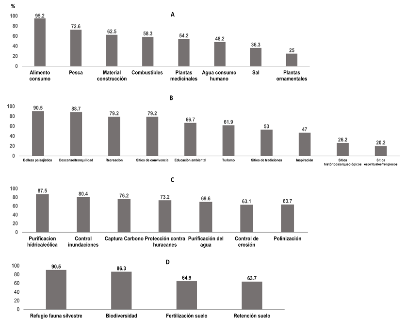 De acuerdo con la frecuencia de mención de cada SE, se identificó que existe un conocimiento diferenciado. Por un lado, más del 90% de los beneficiarios reconoció tres tipos de SE: la provisión de peces, camarón y otros recursos de la pesca como alimento para consumo directo (servicio de provisión); la belleza paisajística (servicio cultural); y la existencia de refugios naturales para animales silvestres (servicio de soporte). En cambio, los SE culturales se mencionaron con menor frecuencia, oscilando entre el 20% y 26%, asociando un bajo valor social para los sitios históricos, sitios con significado espiritual o aquellos con elementos ornamentales (Figura 3).