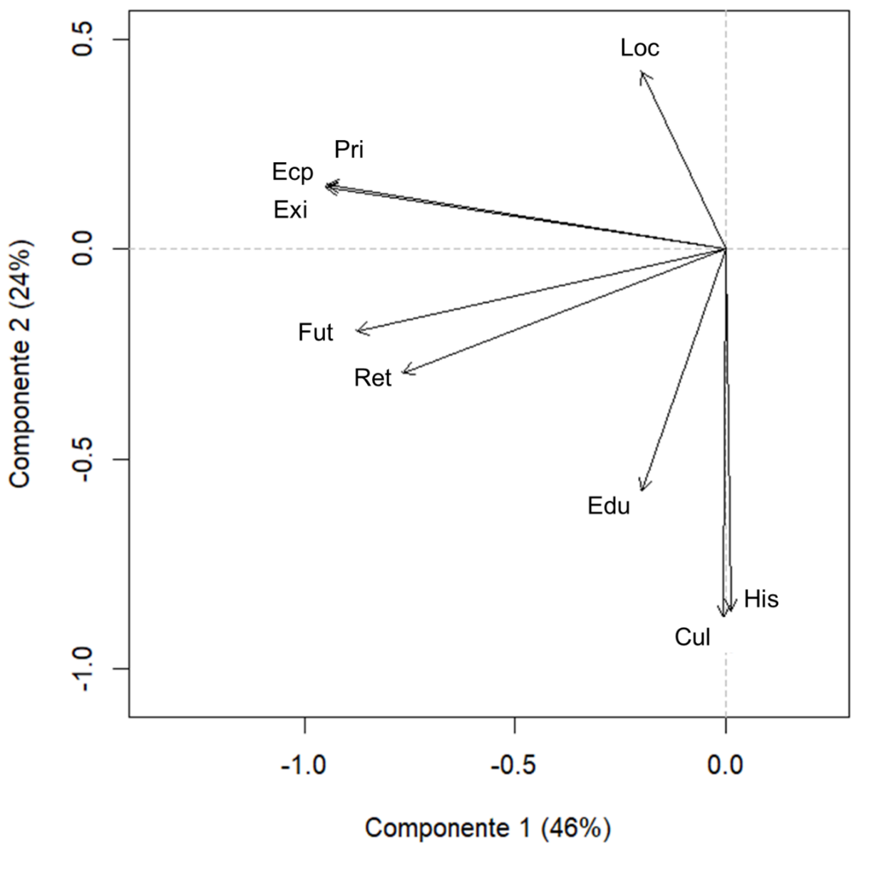Con el ACP categórico se obtuvieron tres componentes principales que explicaron en conjunto el 82% de la variación total. El primer componente contuvo el 46% de la varianza y, en consecuencia, la mayor capacidad explicativa del valor social, seguido del segundo componente con el 24% y el tercero con el 12% (Tabla 5).