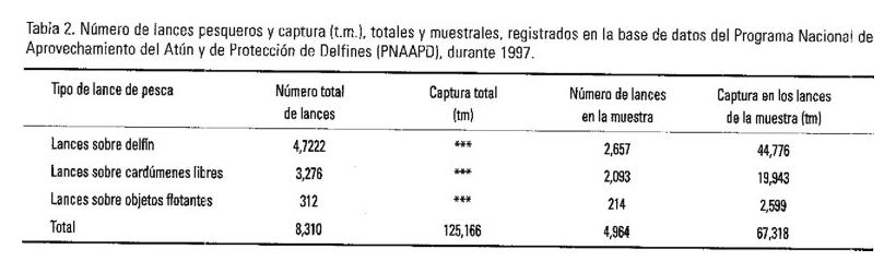 Debido a que no se contó con la información total de las capturas por zona (por ejemplo: información de las bitácoras), fue necesario realizar una estimación de estas, en toneladas métricas (tm), por tipo de lance pesquero y estrato. Para ello, se utilizó la BDO del PNAAPD. En la tabla 2 se presentan las capturas totales de México, así como el número total de lances (por tipo), para 1997.