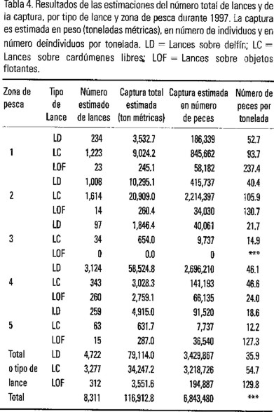 La tabla 4 contiene las estimaciones del número de lances y de la captura total estimada, en toneladas y en número de peces. Si se observa la captura en peso, cerca del 85% de esta fue obtenida a través de LD, un 17% en LC y solamente un 3% en LOF. Sin embargo, si la captura se analiza en número de peces, en LD solamente se capturó un 49% de los peces, mientras que se observa que este porcentaje aumenta en las otras dos maniobras de pesca, para ese año.