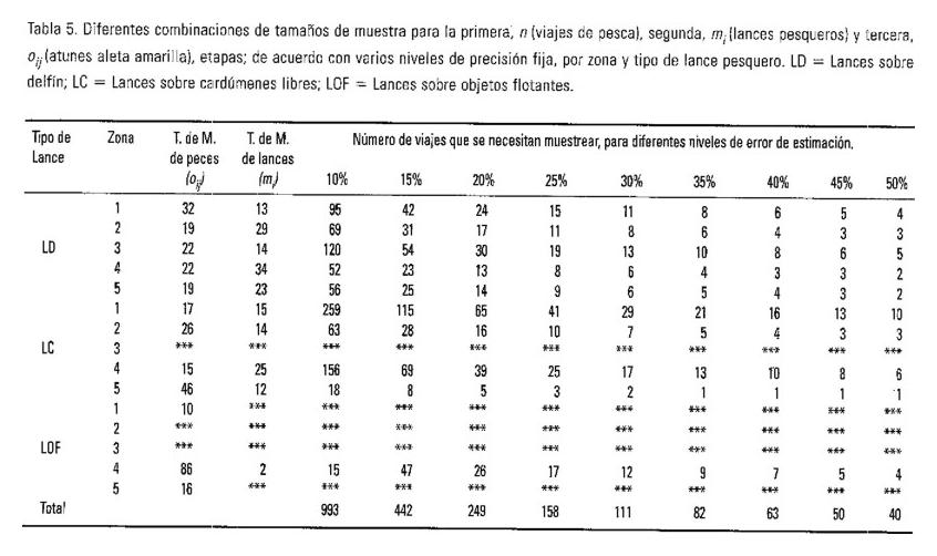 Con el tamaño de muestra óptimo de lances (mi) y peces (oij) por viaje, fijos, es posible analizar cual es el tamaño de muestra óptimo para viajes en un año particular. En la tabla 5 se presentan algunos valores de tamaños de muestra requeridos por zona y tipo de lance pesquero. Durante 1997 la flota mexicana realizó 216 viajes, de los cuales 131 fueron cubiertos por observadores del PNAAPD. Esto indica que el error de estimación (EE), en cada caso, es de alrededor del 25 al 30%, de acuerdo con las muestras obtenidas durante 1997.