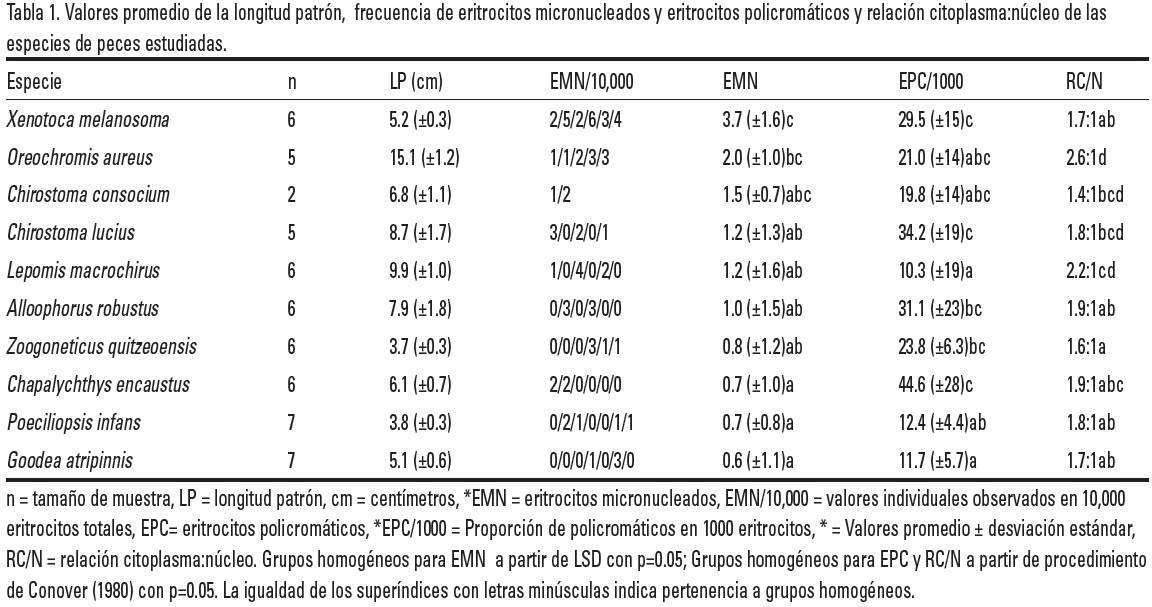 En la tabla 1 se observa que se colectaron 56 organismos de 10 especies diferentes y se describe el tamaño de muestra de cada una de las especies, la longitud patrón de los organismos muestreados, así como valores individuales y promedios (± desviación estándar) de EMN espontáneos en 10,000 eritrocitos totales, la cantidad de EPC en 1,000 eritrocitos y la RC/N.