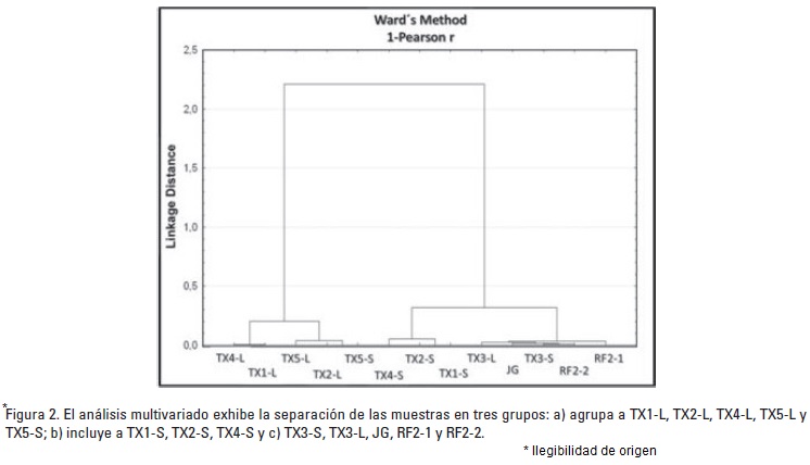 El análisis multivariado utilizando la concentración de metales y los parámetros fisicoquímicos mostró la formación de tres grupos (Fig. 2). El primer grupo estuvo integrado por TX1-L, TX2-L, TX4-L, TX5-L y S, el segundo por TX1-S, TX2-S y TX4-S, y el tercer grupo por TX3-S y L, JG, RF1 y RF2. Este agrupamiento indica que entre las muestras obtenidas existe una diferenciación probablemente dirigida por los cambios ambientales importantes entre lluvias y secas. La excepción a esto fueron TX5 y TX3 donde no se presentó una diferencia entre sus variaciones temporales. Respecto a la variación espacial se observó que TX3 es un sitio con poca similitud con respecto a los otros sitios de ríos o arroyos, aunque similar a los jales de la zona.