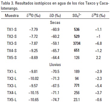 En enero de 2010 se obtuvieron muestras de agua superficial de los arroyos Xochula (JG) y El Fraile II (RF2-1 y RF2-2). El primero recibe la descarga de los jales El Solar, Guerrero I, Guerrero II y desemboca en el río Taxco; en tanto que el arroyo El Fraile II desemboca en el río Cacalotenango. Asimismo, se recolectaron muestras de agua de los ríos Taxco y Cacalotenango y aguas abajo de la unión de ambos ríos (TX1-S a TX5-S) en mayo de 2010 (época de secas) y septiembre de 2011 (lluvias, TX1-L a TX5-L). Se determinaron in situ el pH y la conductividad eléctrica (CE) utilizando un potenciómetro-conductímetro Conductronic PC18 y en laboratorio en muestras sin acidificar utilizando un potenciómetro marca OAKTON serie 510. Se determinó el contenido de sulfatos y las concentraciones de metales y metaloides tóxicos (Zn, Cd, Cu, Fe, Pb y As) en todas las muestras recolectadas. Además, con la finalidad de determinar las razones isotópicas de 18O/16O, D/H, 34S/32S, se recolectaron 125 mL de agua de los sitios TX1 a TX5 de ambos muestreos. La composición isotópica de las muestras de agua se expresa en notación delta por mil (δ%) con respecto al estándar V-SMOW (Vienna-Standard Mean Ocean Water) para el δ18O y δD, y respecto a los estándares de referencia internacional OGS-1 y NBS123 para δ34S.