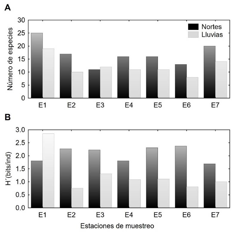 Cabe mencionar que en ambas temporadas el mayor número de especies se presentó en las bocas: E1 (25 en nortes y 19 en lluvias) y E7 (20 en nortes y 14 en lluvias) (Fig. 4 A). En la laguna El Carmen se identificaron un total de 61 especies (39 en nortes y 31 en lluvias), seguida por la laguna La Machona con 51 especies en total (34 en nortes y 24 en lluvias) y el canal Pajonal con sólo 25 (16 especies en nortes y 12 en lluvias).