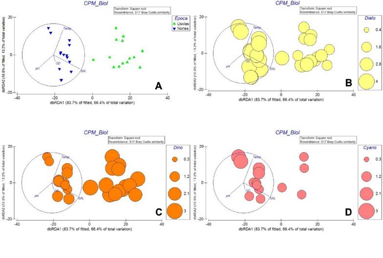 El análisis dbRDA, explicó el 80% de la varianza total en los dos primeros ejes, la temperatura y salinidad se asociaron positivamente con el primer eje definiendo las condiciones ambientales durante la época de lluvias y en contraste, el oxígeno disuelto y el pH determinaron las condiciones de la época de nortes. Las Bacillariophyta y Cyanoprokaryota presentaron su mayor riqueza durante los nortes, mientras que los dinoflagelados se favorecieron de las condiciones desarrolladas en lluvias (Fig. 5 B-D).