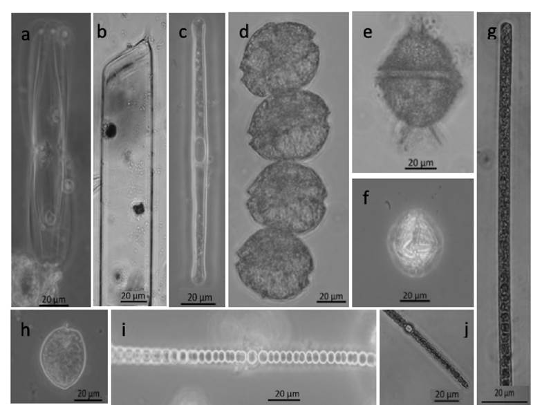Figura 6 Nuevos registros para Carmen Pajonal Machona, a) Plagiotropis arizonica, b) Rhizosolenia imbricata, c) Grammatophora marina, d) Alexandrium monilatum, e) Gonyaulax diegensis, f) G. turbynei, g) Planktothix rubescens, h) Prorocentrum scutellum, i) Dolichospermum smithii, j) Sphaerospermopsis aphanizomenoides. Las imágenes son de autoría propia.