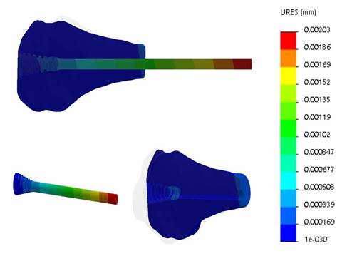 Asimismo, en la Figura 9 se puede observar un diagrama que permite observar las zonas que sufren un mayor desplazamiento al momento de ejercer una fuerza axial a lo largo de la epífisis.