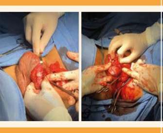 Paciente de 15 años, sin antecedentes patológicos de importancia para el padecimiento actual, que acudió al servicio médico debido a la aparición de una masa vulvar de crecimiento rápido, de 1 año de evolución. En la exploración física se observó una tumoración vulvar de 10 x 4 cm, en forma de herradura y en el contorno de la vulva se visualizó otra tumoración dependiente de la anterior, en el clítoris, de 7 x 5 cm, que simulaba un falo; ambas estaban adheridas a los planos profundos, sin causar dolor a la palpación, móviles, circunscritas, de consistencia blanda, con crecimiento de vello corporal en posición androgénica. Se llevó a cabo la resección del tumor; el procedimiento se inició con el acceso al labio mayor, sin afectar el meato uretral y el clítoris; se observó aumento de la vascularidad y la tumoración se disecó en su totalidad. El reporte histopatológico fue de angiofibroma celular. La evolución de la paciente fue favorable.