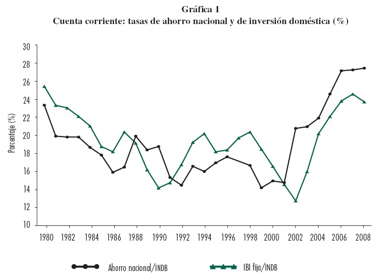 En los noventa, las tasas de inversión doméstica superaron en promedio a las de ahorro nacional, registrándose déficit en la cuenta corriente (véanse tabla 1 y gráfica 1). A su vez, el consumo se incrementó en promedio más que la inversión doméstica (el ahorro cayó a una tasa anual de 2.2%, mientras que la inversión se incrementó sólo 0.2% anual)5. Por su parte, en el periodo posterior a la crisis de 2001, las tasas de ahorro nacional se ubicaron en 24.2% del INDB a precios corrientes (2002-2008), los déficit se revirtieron y la economía pasó a registrar una importante salida neta de capitales durante los primeros años del ajuste. Las tasas de inversión doméstica, que habían caído a 12.8% del INDB a precios corrientes en 2002, se recuperaron a partir de 2004, alcanzando 20.5% del INDB durante el periodo 2002-2008.