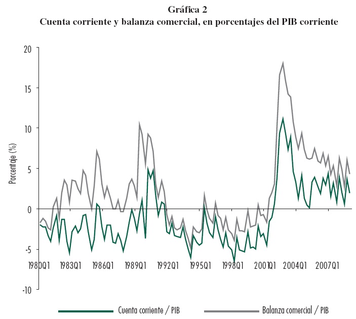 9 Se utiliza el PIB a precios corrientes para escalar el saldo de la cuenta corriente, dado que no se dispone de una serie de INDB con periodicidad trimestral para la totalidad del periodo analizado.