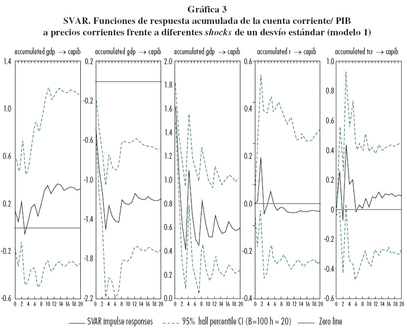 Los resultados de las funciones de impulso-respuesta muestran que la cuenta corriente responde en forma positiva a los shocks en el producto real externo, o en los precios reales de exportación (en este último caso la respuesta es significativa en el corto plazo) y en forma negativa y significativa a los shocks en el producto real doméstico, de forma similar a los modelos donde los shocks de productividad afectan positivamente a la inversión y negativamente a la cuenta corriente. La cuenta corriente presenta también una respuesta acumulada positiva frente a los shocks en las tasas reales de interés (respuesta no significativa) y en el tipo de cambio real multilateral en el mediano plazo.