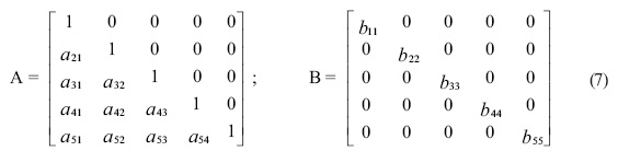 Con k = 5 (cinco variables endógenas), si se especificara a B como una matriz diagonal y se aplicaran en forma recursiva las restricciones sobre la matriz A, se tendría7: