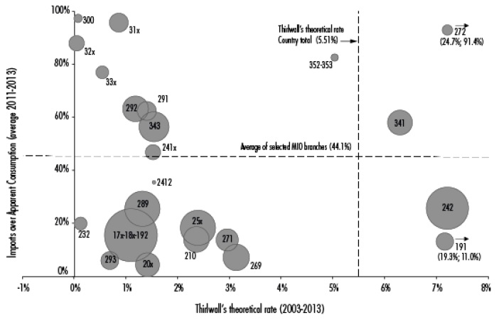 The horizontal slice of the figure, which indicates the average level of import penetration of the MIO sectors for the time period 2011-2013 (44.1%), will be taken as a reference to assess the degree of import penetration present in the various sectors.