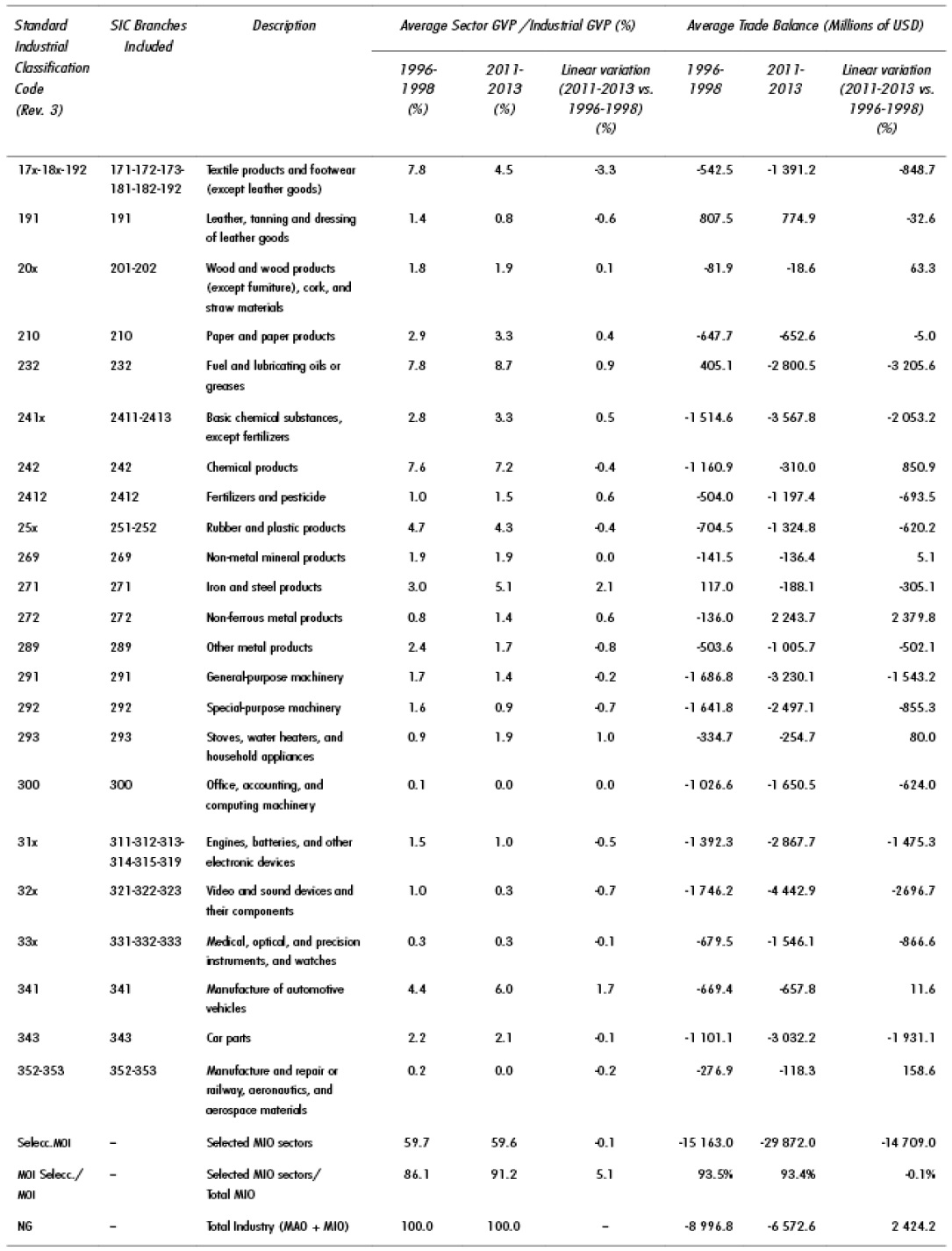 Table A.1 Share in the Industrial GVP and Trade Balance of Selected MIO Sectors. Averages: 1996-1998 and 2011-2013