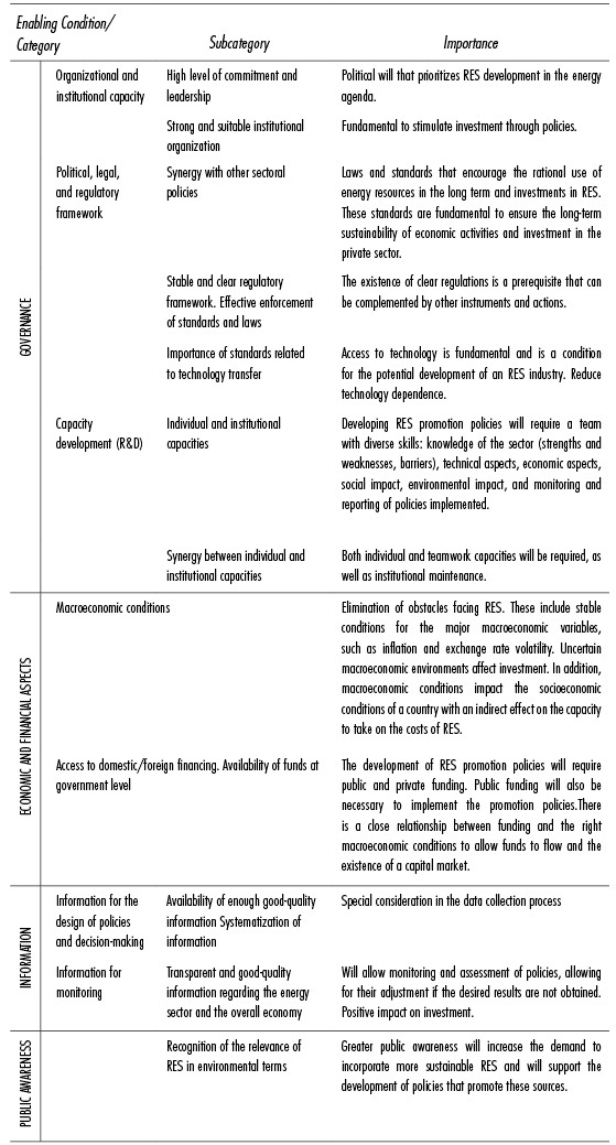 Table 1 shows a breakdown of the conditions that enable RES to develop. It is important to note that each condition will have a different influence on technology development, by virtue of the specific features of the market conditions that exist (Boldt et al., 2012: 9-13). Favorable environmental conditions will also facilitate the removal of entry barriers facing RES, through well-designed development policies. Although each barrier will require a country to adopt different policies or instruments, countries tend to implement a portfolio of measures, which carefully complement each other, to define a path for the growth and development of these sources in the medium or long term (Foxon et al., 2007 in IIASA, 2012: 876).
