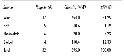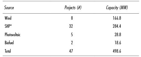 Table 3 shows the RES installed capacity as of 2014. Many of the wind, photovoltaic, and biomass power projects were implemented in the framework of GENREN. There are also some other joint initiatives between the provinces and national agencies, such as the Arauco Wind Farm, which are projects carried out by the national and provincial governments, with schemes quite similar to those seen in the GENREN projects, with 15-year contracts and a rate of 126.46 dollars/MWh (Villalonga, 2013: 38). In some cases, the role of foreign financing, although still minimal, has been fundamental, such as for the Diadema Wind Farm. Despite this situation, five years after the launch of the GENREN program, only 130 MW of the 754 wind power MW (17%); 7.2 MW of the 20 photovoltaic MW (36%); 1 MW of biogas and 1 MW of SHP are actually up and running.