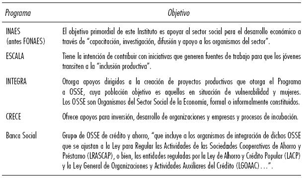 Se encontraron programas de carácter social dependientes del Instituto Nacional de la Economía Social (INAES, antes FONAES), el cual pertenece a la Secretaría de Economía; contenidos en cuatro convocatorias: ESCALA, INTEGRA, CRECE y Banca Social. Estos programas están enfocados al apoyo de grupos sociales vulnerables: jóvenes, mujeres, adultos mayores y público en general que habitan en zonas de pobreza y extrema pobreza (véase cuadro 4).