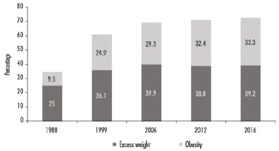 The problem is even more severe if we look at the burden attributable to adults alone over time. Between 198 and 2016, the combined prevalence of excess weight and obesity in adults practically doubled, from 34.5% to 72.5%, although the biggest jump happened in the nineteen-nineties. However, the dynamic was different for the two factors: excess weight grew 57$, going from a prevalence of 25% to 39.9% during the time period; obesity skyrocketed 251% if we look at the change of prevalence from 9.5% at the beginning of the period to 33.3% by the end (see Figure 1).