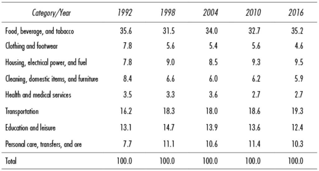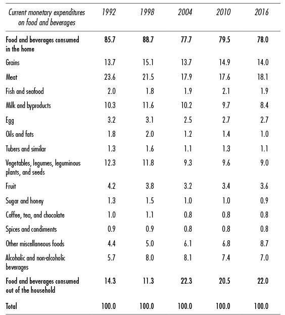 Table 1 Mexico: Composition of Current Monetary Expenditures on Food and Baverage by Product, 1992-2016 (percentage)