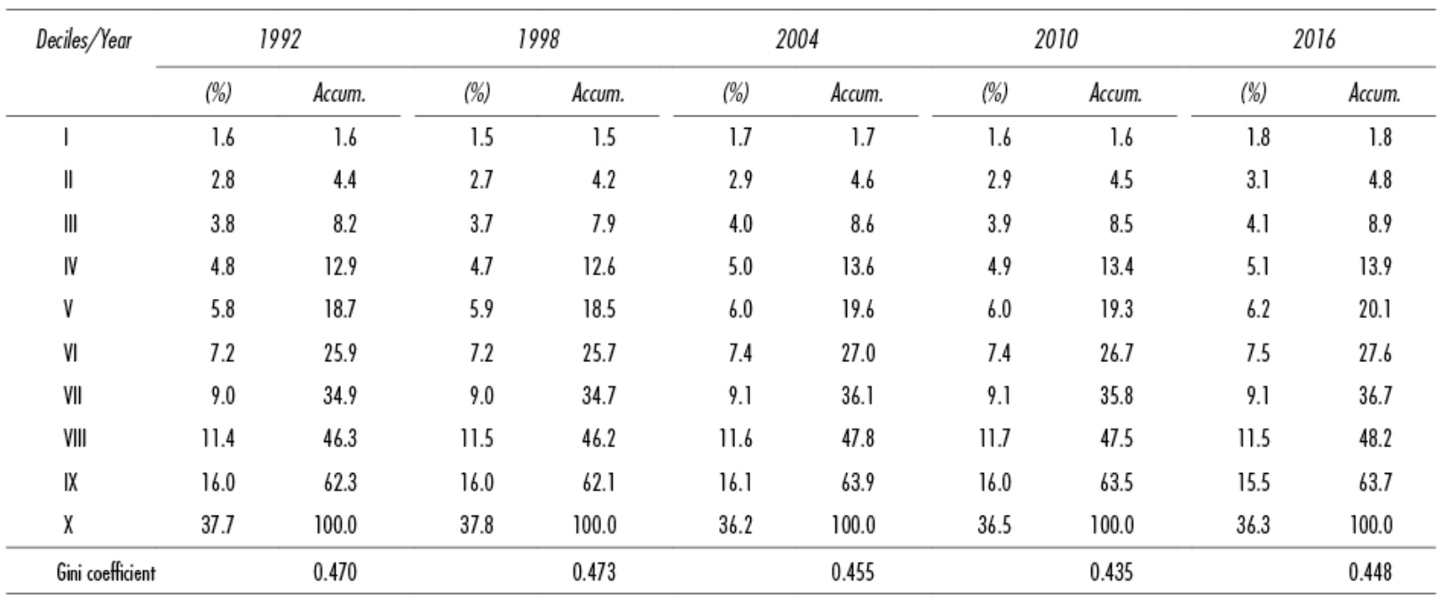 Table 2 Mexico: Distribution by Household Decile, 1992-2016 (percentage)