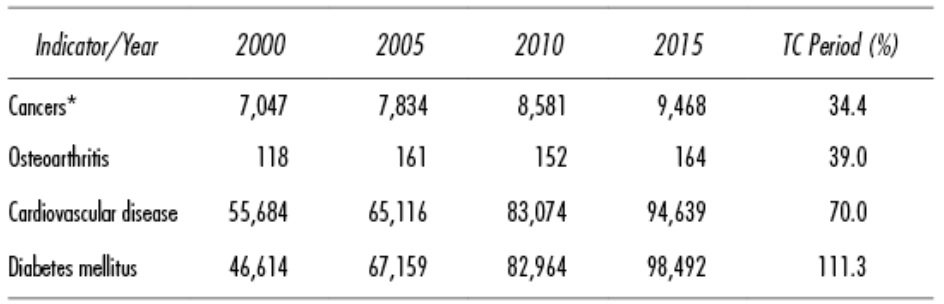 The consequences of excess weight and obesity are diverse chronic or degenerative diseases that undermine Mexico’s economic activity du to premature deaths and low productivity. Likewise, they have a significant impact on the Health System, as a good deal of resources need to be allocated to medical care, lowering the income of the sick, and affecting the household income-spending ratio. Between the years 2000 and 2015, the number of total deaths per disease related to excess weight and obesity grew faster; deaths from cancer, osteoarthritis, cardiovascular problems, and diabetes mellitus grew 34.4, 39, 70, and 111.3%, respectively (see Table 4). Nevertheless, the increased mortality in diabetes mellitus and hypertension was striking; the former rate went from 46.1% to 82.6%, while the second changed from 9.7% to 21.4% in the time period (SSA, 2015).