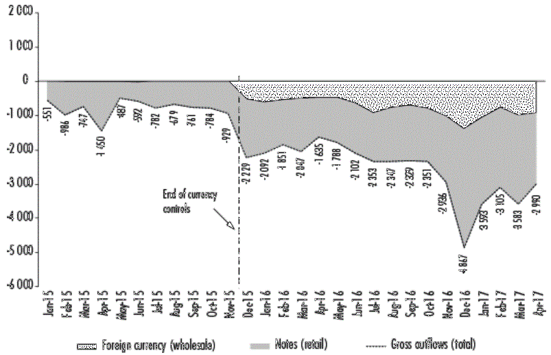 On top of that, net currency outflows in the form of remitting profits and dividends abroad accounted for 1.752 billion dollars between December 2015 and November 2016, in contrast with just 242 million dollars between December 2014 and November 2015, meaning there was an inter-annual increase of 1037% (see Figure 6). The average monthly outflow in this category between January and November 2015 was 22 million dollars, which jumped to 213 million dollars between December 2015 and April 2017. The trend held steady into the first months of 2017; between January and April 2017, 466 million dollars were sent abroad.