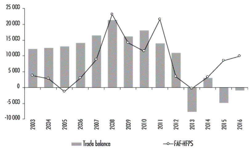 As the financial valorization model was exhausted, a new capital accumulation pattern emerged in 2002, substantially different than the model predating it (Basualdo, 2011). From that point forward, Argentina began to settle its debt with international bodies and private owners of government bonds, interrupting that intrinsic link between currency outflows and foreign debt. Thus, capital flight was no longer underwritten by foreign loans, and began to rest instead on the trade balance surplus. Figure 1 shows how the stock of capital flight and foreign debt evolved over different phases of history in Argentina. It shows the clear and close link between capital flight and foreign debt in the run-up to 2002, the interruption of this relationship-starting that same year and lasting throughout 2002-2015-, a time of significant debt reduction, when outgoing currency was essentially fed by the positive trade balance.