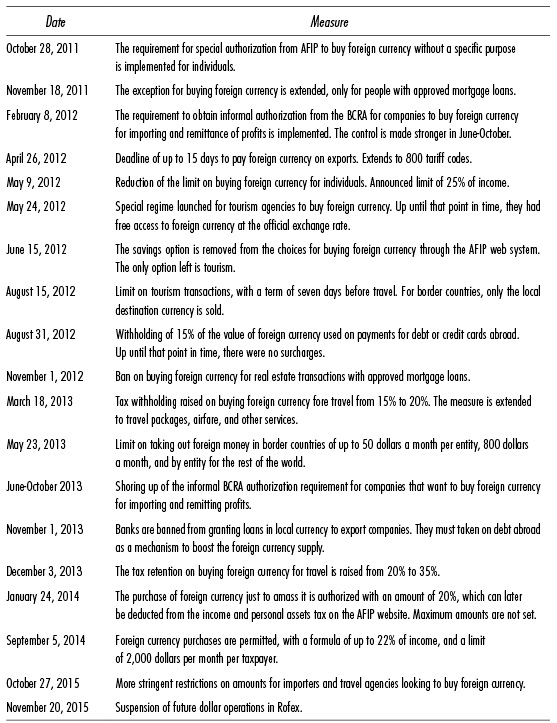 Table 2 Argentina. Principal Control Measures on the Buying Dollars in the Foreing Exchange Market.