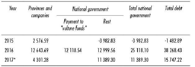 In 2016, the national government took out foreign debt worth 25.118 billion dollars, of which 12.119 billion were directly channeled into paying out the ruling in favor of the holdouts. On the other side, the provinces and the private sector issued debt worth 12.643 billion dollars. The process continued on into the first three months of 2017, when a total of 15.747 billion was issued.