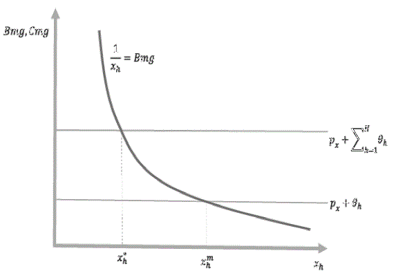 Where v h = ln (x h ) - θ һ х һ represents the preference structure of family type h, and where x h is the private consumption of good χ and θ һ > 0 is a constant. The consumption of good x h causes a negative externality for all families in the economy, since this good causes pollution (consider goods whose consumption induces a residual effect on environmental pollution). However, type h families only consider how the consumption of this good affects their own well-being, and do not take into account the negative externality that it creates for the rest of the families in society. The personal effect of pollution by good x h in type h families is given by -θ һ х һ .