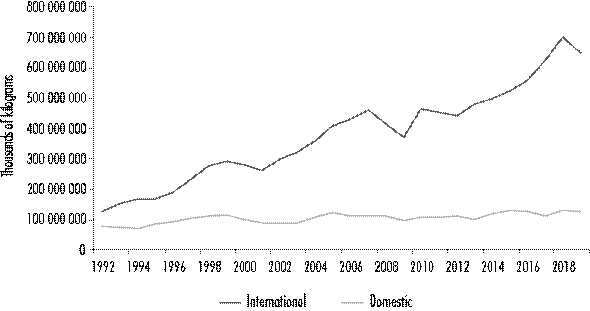 Figure 2 Total domestic and international cargo behavior 1992-2019 (thousands of tons).