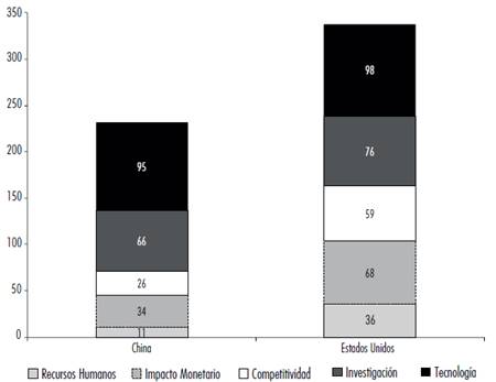 Por otra parte, el Índice de Potencialidades en Inteligencia Artificial (Ding, 2018) muestra que Estados Unidos dobla el puntaje obtenido por China,8 lo que permite resumir y presentar las ventajas relativas que lograron ambos países por esos años (véase tabla 1).