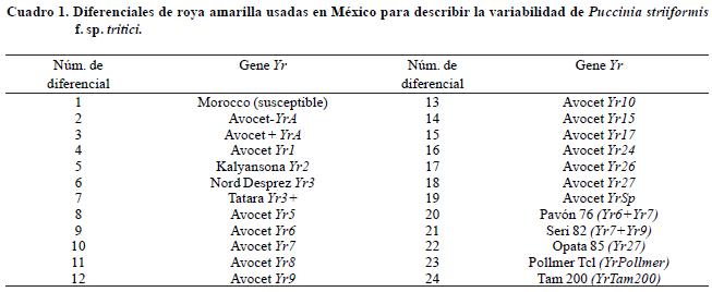 Para la identificación de razas fisiológicas se utilizó un conjunto de 24 líneas diferenciales disponibles en fondo de AvocetYrA usadas a partir de 2002, como se indica en el Cuadro 1.