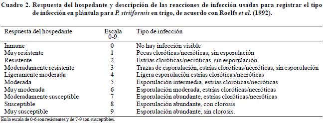 La inoculación de los grupos de diferenciales se realizó de la misma manera que se hizo en los incrementos y las purificaciones de las razas previamente descritos. Se tomó la reacción de infección en estado de plántula a los 1518 días después de la inoculación; para esto se utilizó la escala visual de 09 propuesta por Roelfs et al. (1992) como se indica en el Cuadro 2.
